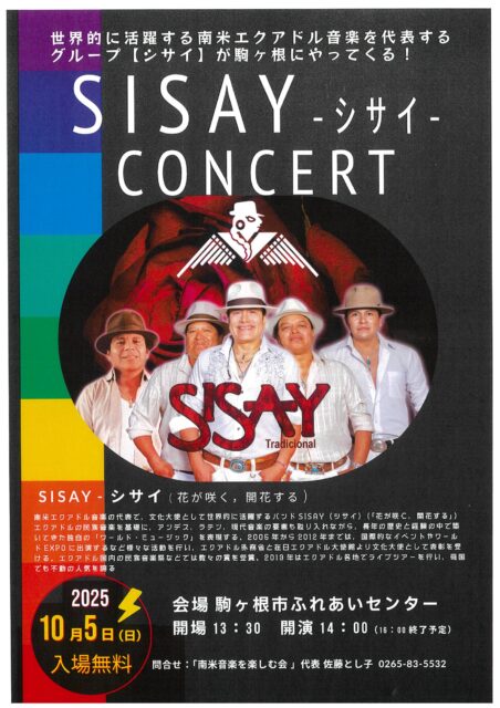 10/5(日) 開演14:00~16:00 駒 ケ 根市ふれあいセンターにて、「SISAY CONCERT」を開催します。