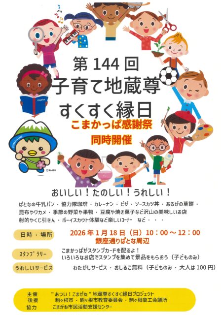 「144回子育て地蔵尊すくすく縁日」「こまかっぱ感謝祭」が同時開催されます。